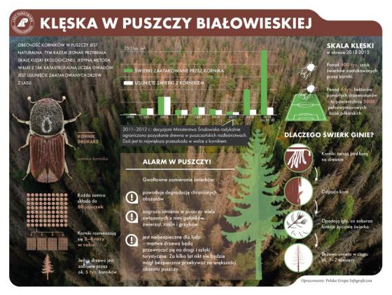 W Nadleśnictwie Białowieża gwałtowny rozwój gradacji kornika drukarza spowodował rozpad drzewostanów z przewagą świerka. Konieczność sporządzenia aneksu do obowiązującego planu urządzenia lasu w Nadleśnictwie Białowieża jest konsekwencją klęski spowodowanej gradacją kornika drukarza. Nadleśniczy ma obowiązek walczyć z tym rozprzestrzeniającym się zjawiskiem zgodnie z ustawą o lasach i Instrukcją Ochrony Lasu.