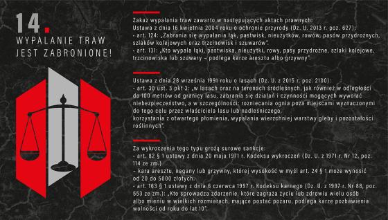 Wypalanie traw, łąk i nieużytków rolnych jest zabronione. Grozi za to kara grzywny w wysokości 5 tys. zł, a nawet kara 10 lat pozbawienia wolności. Za wywołanie pożaru traw grożą poważne konsekwencje prawne, może też to skutkować utratą dopłat bezpośrednich z Unii Europejskiej.