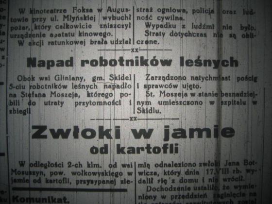 Obok wsi Gliniany, gm. Skidel 5-ciu robotników leśnych napadło na Stefana Moszeja, którego pobili do utraty przytomności i zbiegli.