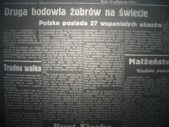 - Hodowla żubrów w Polsce rozwija się pomyślnie. Stado w Białowieży z 5-ciu sztuk zakupionych przez administrację lasów państwowych w r. 1930-ym, wzrosło do 15-tu sztuk, licząc w tem byka przeniesionego do ogrodu Zoologicznego w Warszawie. W Pszczynie straty spowodowane ubytkiem dwóch sztuk w roku ubiegłym, padłych wskutek wypadku, wyrównały się z przychówkiem tak, że stado liczy znowu 9 sztuk. W ogrodach zoologicznych w Warszawie i Poznaniu SA razem 3 sztuki, ogólna więc ilość żubrów w Polsce sięga liczby 27 sztuk. Biorąc pod uwagę, że ogólna ilość żubrów na świecie wynosi około 140-tu sztuk, polska hodowlę umieścić można na drugiem miejscu. Najwięcej, bo około 60 sztuk żubrów jest w Anglji.