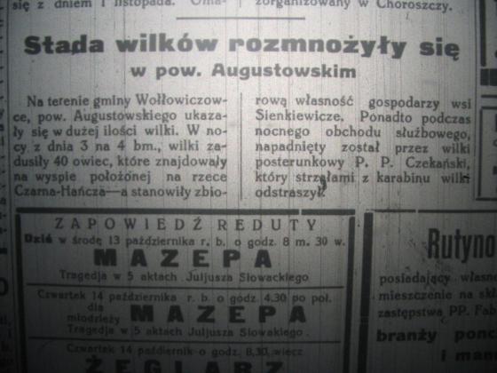 Na terenie gminy Wołłowiczowce, pow. Augustowskiego ukazały się w dużej ilości wilki. W nocy z dnia 3 na 4 bm., wilki zadusiły 40 owiec, które znajdowały się na wyspie położonej na rzece Czarna-Hańcza - a stanowiły zbiorową własność gospodarzy wsi Sienkiewicze. Ponadto podczas nocnego obchodu służbowego, napadniety został przez wilki posterunkowy P. P. [Policji Państwowej – przyp. J. K.] Czekański, który strzałami z karabinu wilki odstraszył.