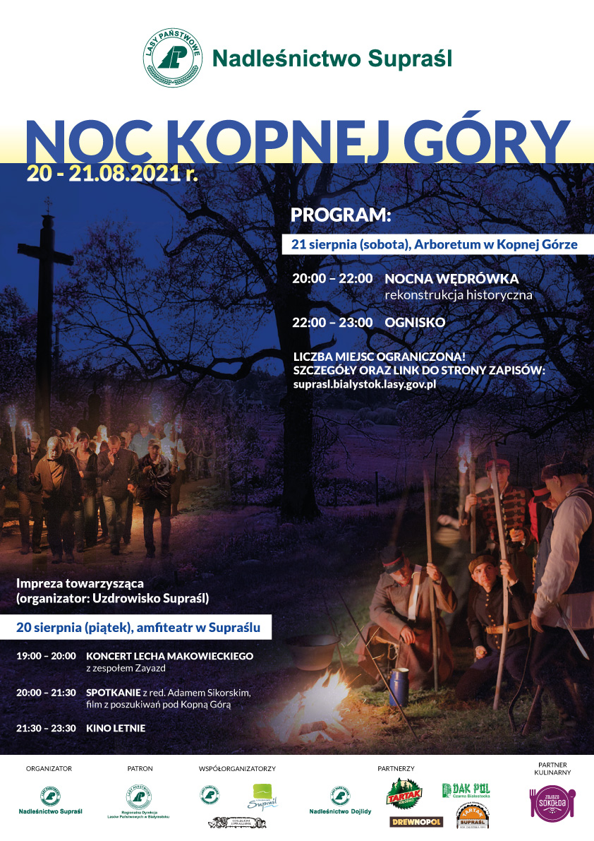W sobotę 21 sierpnia suprascy leśnicy zaproszą Państwa na nocny spacer ścieżkami Arboretum w Kopnej Górze. Opowiedzą o historii tego miejsca, o dawnych, dramatycznych wydarzeniach z nim związanych. Dzięki udziałowi rekonstruktorów wędrówka stanie się okazją do spotkania z cieniami przeszłości. Jesteśmy przekonani, że także tym razem Organizatorzy dostarczą Państwu wielu emocji i niezapomnianych wrażeń.