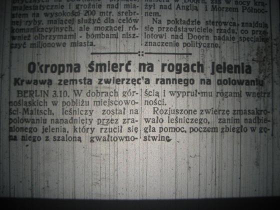BERLIN 3.10. W dobrach górnośląskich w pobliżu miejscowości Maltach, leśniczy został na polowaniu napadnięty przez zranionego jelenia, który rzucił się na niego z szaloną gwałtownością i wypruł mu rogami wnętrzności