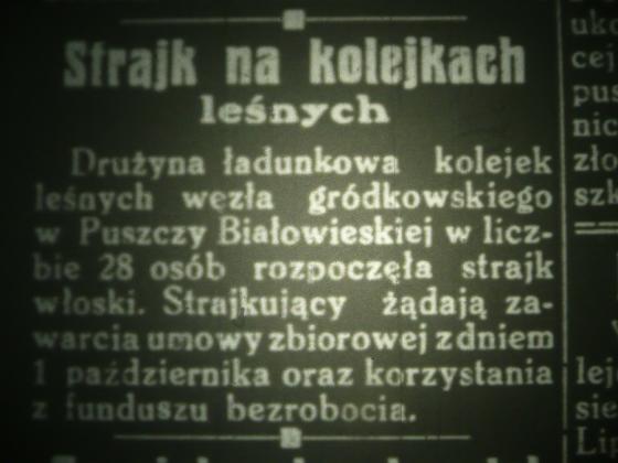 Drużyna ładunkowa kolejek leśnych węzła grodkowskiego w Puszczy Białowieskiej w liczbie 28 osób rozpoczęła strajk włoski. Strajkujący żądają zawarcia umowy zbiorowej z dniem 1 października oraz korzystania z funduszu bezrobocia.