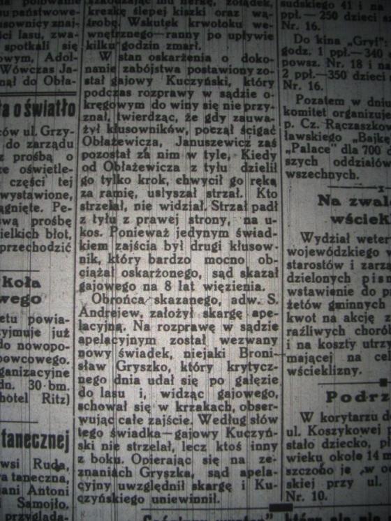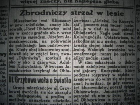 Mieszkaniec wsi Klinczany w pow. sokólskim, znany kłusownik, Józef Błażewicz udał się w końcu grudnia ub. r. wraz ze swym sąsiadem, Józefem Januszkiewiczem, na polowanie do pobliskiego lasu państwowego. Kiedy obaj kłusownicy znajdowali się w części lasu zwanej „Dąbrówka”, spotkali się oko w oko z gajowym, Adolfem Kuczyńskim. Wówczas Januszkiewicz krzyknął do Błażewicza: „Uciekaj, bo Kuczyński”, poczem sam zaczął uciekać, a w ślad za nim pobiegł Błażewicz. Nagle padł strzał. Kula ugodziła Błażewicza, uszkadzając mu nerkę, żołądek, krezkę ślepej kiszki oraz wątrobę. Wskutek krwotoku wewnętrznego – ranny po upływie kilku godzin zmarł.