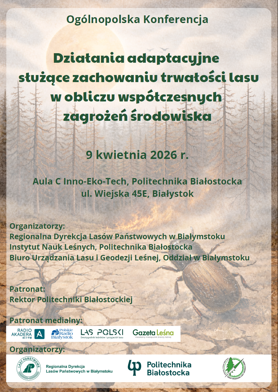 W odpowiedzi na te potrzeby Regionalna Dyrekcja Lasów Państwowych w Białymstoku, Biuro Urządzania Lasu i Geodezji Leśnej oraz Instytut Nauk Leśnych Politechniki Białostockiej organizują Ogólnopolską Konferencję pt. „Działania adaptacyjne służące zachowaniu trwałości lasu w obliczu współczesnych zagrożeń środowiska”, która odbędzie się w dniach 9–10 kwietnia 2026 r.