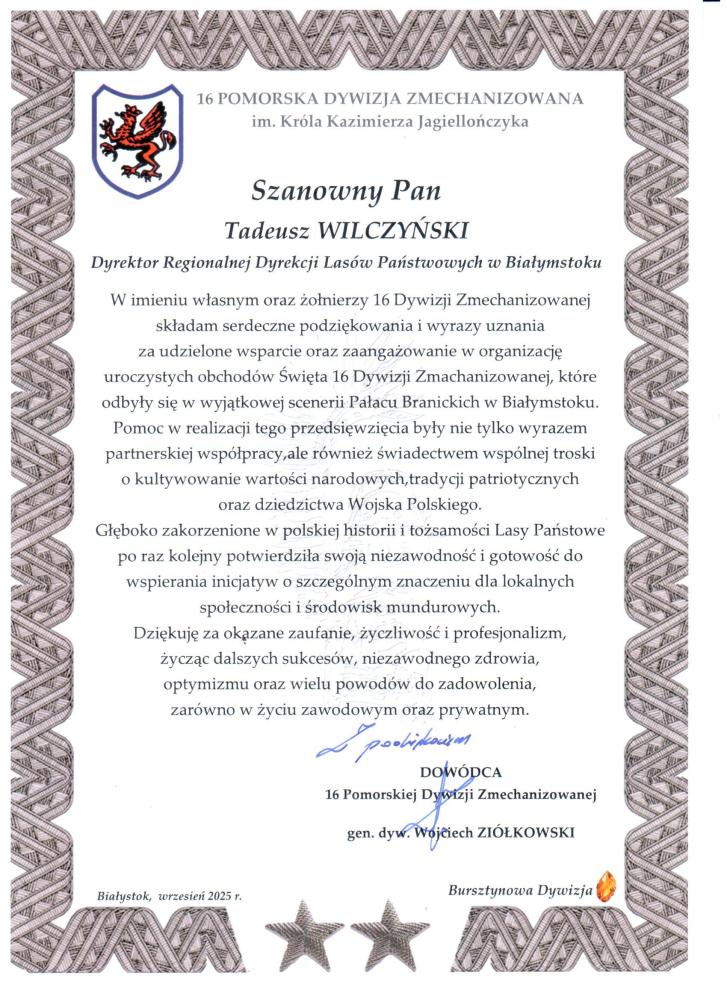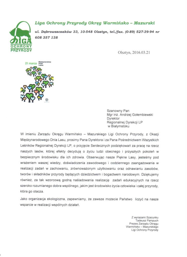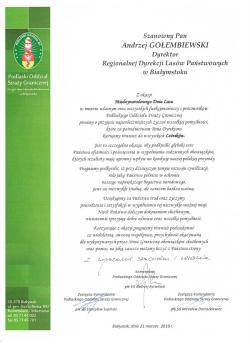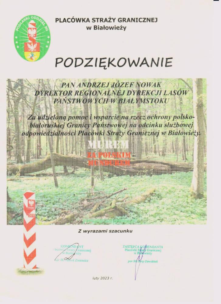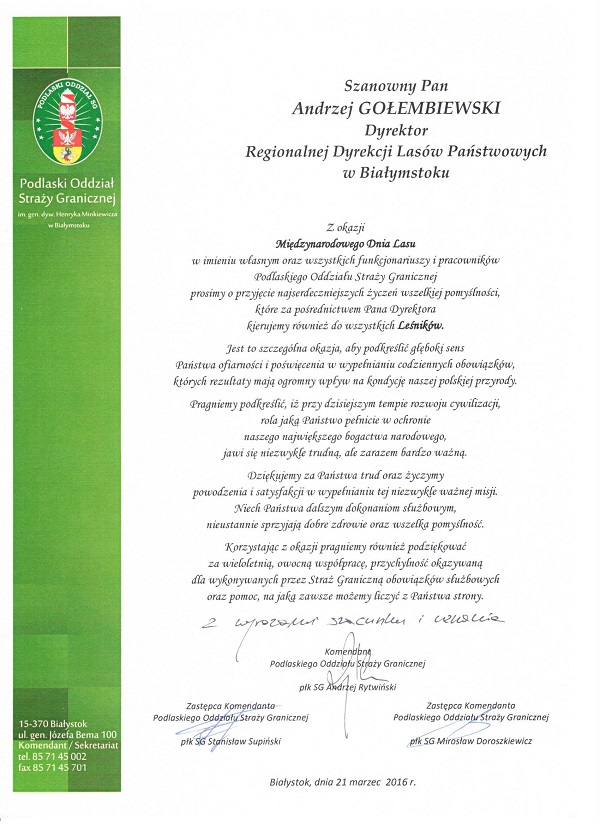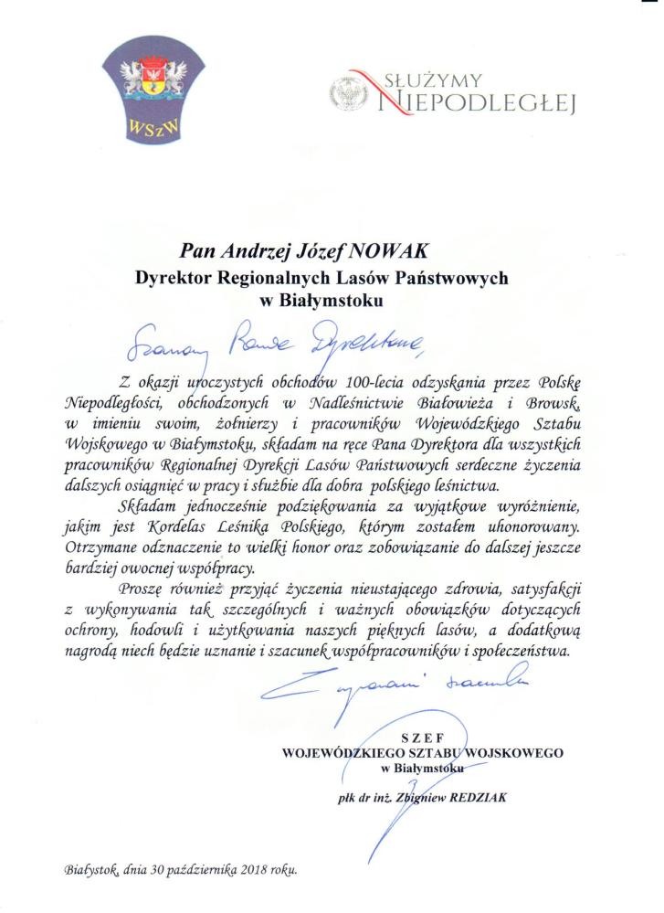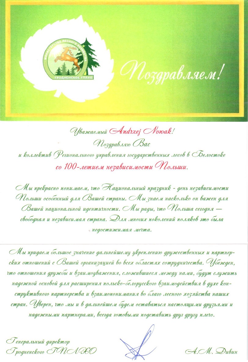 Szanowny Panie Andrzeju Nowak! Składam serdeczne życzenia Panu i zespołowi Regionalnej Dyrekcji Lasów Państwowych w Białymstoku z okazji 100-lecia Niepodległości Polski. Dobrze wiemy, że narodowe święto- Dzień Niepodległości Polski jest szczególnie ważny dla Waszego kraju. Wiemy jak ważny jest on dla Waszej narodowej tożsamości. Jesteśmy szczęśliwi, że dzisiaj Polska to wolny i niepodległy kraj. Dla wielu pokoleń Polaków było to nieosiągalne marzenie. Bardzo duże znaczenie ma dla nas dalsze umacnianie przyjacielskich i partnerskich relacji z Waszą organizacją na wszystkich szczeblach współpracy. Chcę zapewnić, że przyjazne i pełne wzajemnego szacunku stosunki, jakie nawiązaliśmy, posłużą za mocną podstawę dla rozszerzenia polsko-białoruskiej współpracy w duchu konstruktywnego partnerstwa, dla dobra gospodarki leśnej naszych krajów. Jestem przekonany, że również i w przyszłości będziemy prawdziwymi przyjaciółmi i niezawodnymi partnerami, zawsze gotowymi do wzajemnej pomocy.